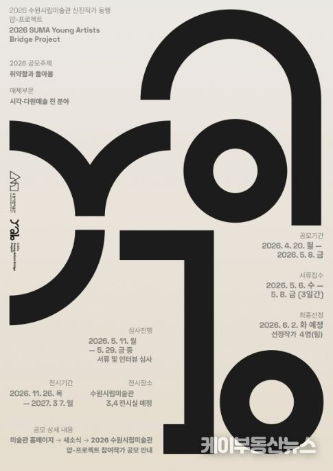 케이부동산뉴스 김교민 기자 | 경기도 수원시립미술관은 신진작가 발굴 및 창작 지원을 위한 공모 사업‘신진작가 동행 얍-프로젝트(YAB-Project)’를 개최하고 4월 20일부터 5월 8일까지 참여자 모집 공고를 시작한다. 서류 접수는 5월 6일부터 5월 8일 오후 6시까지 이메일을 통해 진행된다.
