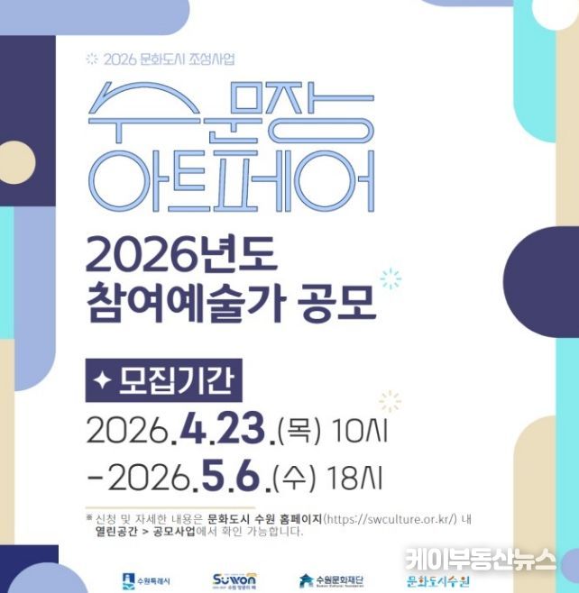 케이부동산뉴스 김교민 기자 | 수원문화재단은 지역 예술가의 작품 판로 확대와 지속가능한 창작 활동 기반 마련을 위해 2026년 ‘수문장 아트페어’ 참여 예술가를 모집한다.