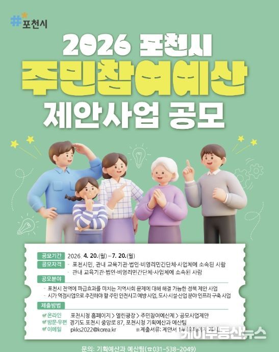 케이부동산뉴스 김교민 기자 | 포천시가 4월 20일부터 오는 7월 20일까지 2027년도 예산편성을 위한 주민참여예산 공모제안사업을 접수하고 있다.