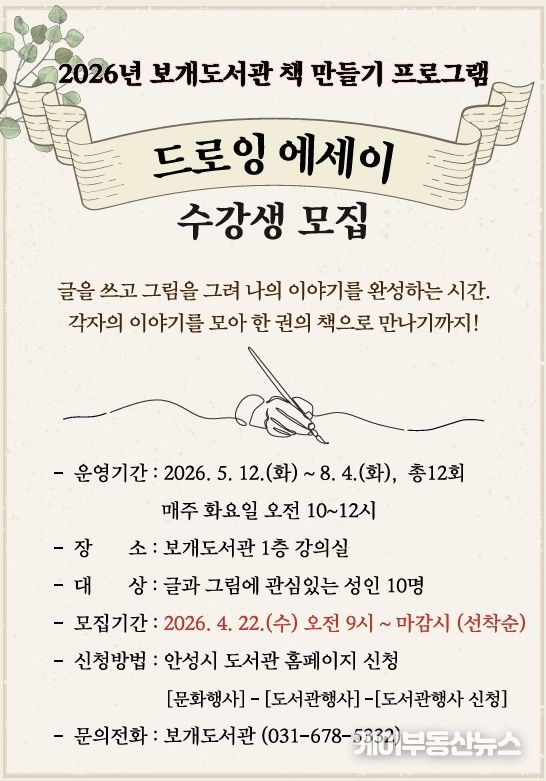케이부동산뉴스 김교민 기자 | 안성시 보개도서관(책문화센터)이 시민들의 창작 활동을 지원하고 일상 속 예술 경험을 확대하기 위해 오는 5월부터 ‘드로잉 에세이’와 ‘포토 에세이’ 책 만들기 프로그램을 새롭게 운영한다고 밝혔다.