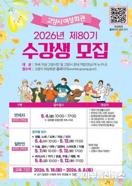 케이부동산뉴스 김교민 기자 | 고양특례시 여성회관은 오는 5월 4일부터 12일까지 2026년 제80기 정규강좌 수강생을 모집한다.