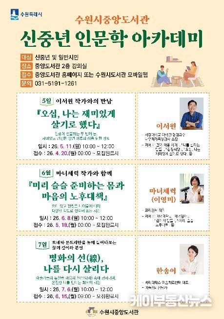 케이부동산뉴스 김교민 기자 | 수원시 중앙도서관이 5월부터 7월까지 매달 1회 운영하는 ‘신중년 인문학 아카데미’ 수강생을 모집한다.