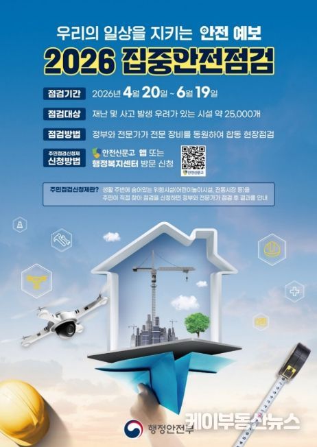 케이부동산뉴스 김교민 기자 | 파주시는 재난 및 안전사고를 사전에 예방하고 시민들이 안심하고 생활할 수 있는 안전한 환경을 조성하기 위해 녪집중안전점검’을 4월 20일부터 6월 19일까지 실시한다.