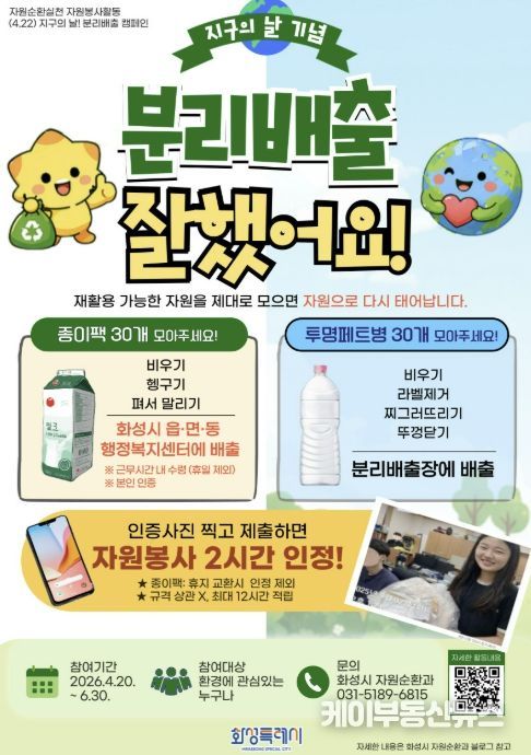 케이부동산뉴스 김교민 기자 | 화성특례시가 2026년 ‘지구의 날(4월 22일)’을 맞아 시민들이 일상 속에서 환경 보호를 실천할 수 있는 자원봉사 활동 '분리배출 잘했어요' 캠페인을 운영한다고 밝혔다.