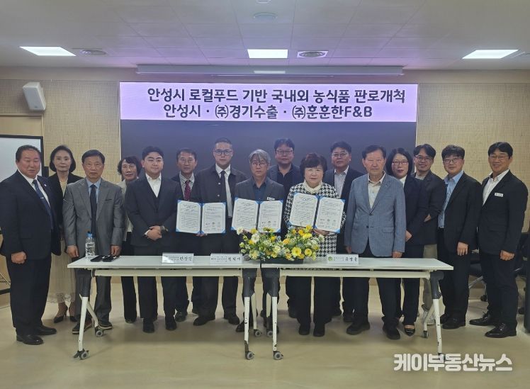 케이부동산뉴스 김교민 기자 | 안성시 농업기술센터는 지난 4월 17일, 안성시 농특산물 및 농식품의 국내외 판로 확대를 위해 ㈜경기수출, ㈜훈훈한F&B와 전략적 업무협약(MOU)을 체결했다고 밝혔다.