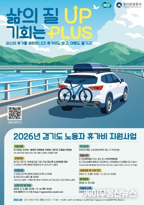 케이부동산뉴스 김교민 기자 | 경기도가 경제적 부담으로 휴식을 포기했던 비정규직과 특수형태근로종사자에게 휴가비를 지원하는 ‘취약노동자 휴가비 지원사업’ 참여자를 5월 4일부터 14일까지 모집한다.