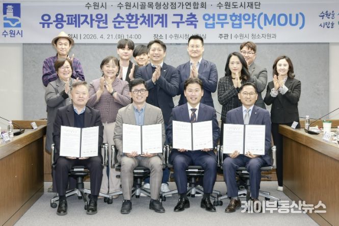 수원시는 21일 시청 상황실에서 수원시골목형상점가연합회, 수원도시공사, 수원도시재단과 ‘유용 폐자원 순환 체계 구축 업무협약’을 체결하고, 협력을 약속했다.