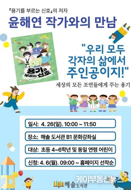 이번 행사는 해솔도서관 어린이 자료실 3~4월 전시 도서 연계 프로그램의 일환으로, 도서관 전시 도서에 대한 관심을 배가시키고, 어린이들이 직접 전시 도서의 주제(‘네 삶의 주인공이 되어줘!’)와 관련된 활동에 참여할 수 있도록 마련됐다. 특히, 윤해연 작가와 또래 친구들과 함께 그의 도서 '용기를 부르는 신호'(서유재, 2025)에 등장하는 인물들이 내는 서로 다른 용기를 들여다보며 주인공이란 특별한 능력을 지닌 사람이 아닌, 용기를 내고 한 걸음씩 나아가는 사람이라는 것을 깨닫게 되는 시간이 될 것으로 기대된다.