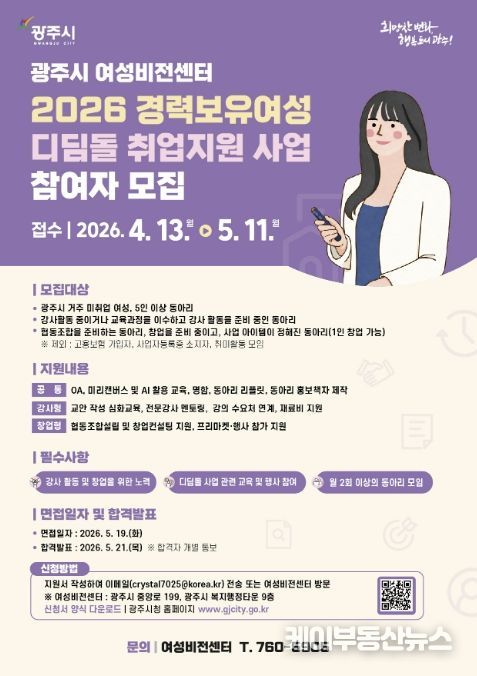 케이부동산뉴스 김교민 기자 | 광주시는 지역 내 경력보유여성의 사회 재진출과 취업 역량 강화를 위해 ‘2026 경력보유여성 디딤돌 취업 지원 사업’ 참여자를 오는 5월 11일까지 모집한다고 22일 밝혔다.