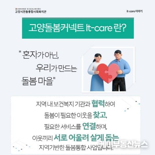 고양돌봄커넥트 It-care 사업은 복합적인 위기에 처한 주민들이 지역사회 안에서 건강하고 독립적인 생활을 유지할 수 있도록 보건과 복지 서비스를 하나로 잇는 통합돌봄 체계를 구축하는 사업이다.