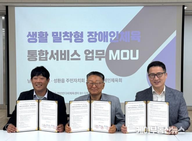 케이부동산뉴스 김교민 기자 | 천안시장애인체육회는 22일 천안반다비체육센터에서 성환읍 주민자치회, 남서울대학교와 ‘생활밀착형 장애인체육 통합서비스 구축을 위한 업무협약’을 체결했다.