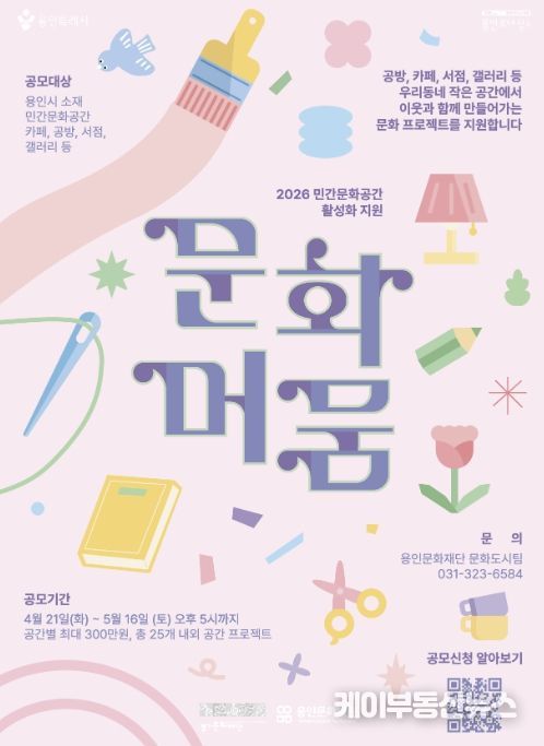케이부동산뉴스 김교민 기자 | 용인문화재단은 오는 5월 16일까지 ‘민간문화공간 활성화 지원사업 '문화머뭄'’의 참여 공간을 모집한다고 밝혔다. 지난해 25개소 공간에서 203회의 프로그램을 운영하며 2,101명의 시민 참여를 이끌어낸 ‘문화머뭄’ 사업은 올해 재단 자체 재원을 매칭하여 총 25개소의 민간문화공간을 선정하고, 공간별 최대 300만 원까지 프로젝트 운영비를 지원할 예정이다.