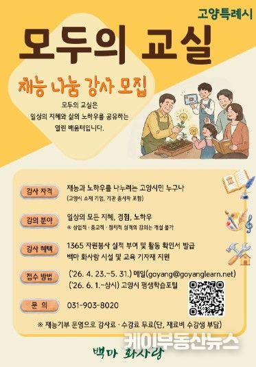 케이부동산뉴스 김교민 기자 | 고양특례시가 올해 시민의 재능을 지역의 배움으로 연결하는 백마 화사랑 ‘모두의 교실’을 운영하며, 재능을 기부할 시민 강사를 상시 모집한다고 23일 밝혔다.