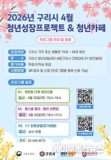 청년성장프로젝트는 지난 2월 고용노동부 공모사업 선정에 따라 추진되는 사업으로, 청년 친화 공간을 기반으로 맞춤형 프로그램과 상담을 제공해 청년의 사회 진입과 구직활동을 지원한다. 구리시는 이번 사업을 통해 청년들이 생활권 가까이에서 다양한 체험 행사에 참여하고 진로상담도 받을 수 있도록 지원할 계획이다.