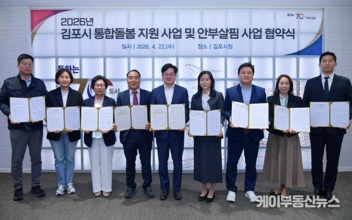 케이부동산뉴스 김교민 기자 | 김포시가 일상생활 서비스 제공기관 6개소, 관내 종합 병원 2개소, 김포시 우체국과 함께 김포시 통합돌봄사업 및 안부살핌 사업 추진을 위한 업무협약을 22일 체결했다. 이번 업무협약은 '돌봄통합지원법'시행에 발맞춰 돌봄이 필요한 65세 이상 노인을 대상으로 시행하는 것으로, 가사·식사 지원, 목욕 및 이동 등 생활에 필수적인 서비스부터 고립 예방까지 체계적 지원이 이뤄질 것으로 기대된다.