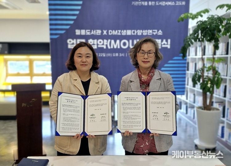 케이부동산뉴스 김교민 기자 | 파주시 월롱도서관은 지난 22일 디엠지(DMZ)생물다양성연구소와 지역사회 독서진흥 및 생태환경 분야 협력을 위한 업무협약을 체결했다.