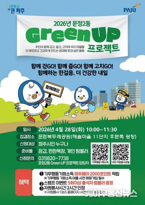 케이부동산뉴스 김교민 기자 | 파주시 운정2동은 오는 28일 10시부터 운정 북두레공원에서 주민과 함께하는 시민 참여형 환경·건강 프로그램 ‘제3회 그린 업(Green UP) 프로젝트’를 개최한다.