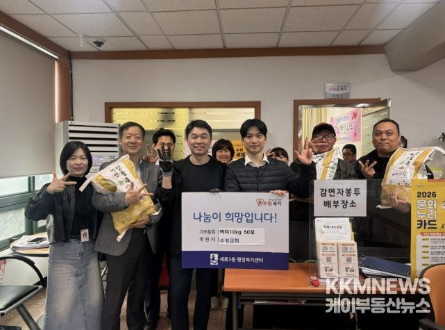 케이부동산뉴스 김교민 기자 | 수원시 권선구 소재 수성교회는 세류3동행정복지센터에 쌀 50포를 기부하며, 지역 내 어려운 이웃을 위한 따뜻한 나눔을 실천했다.