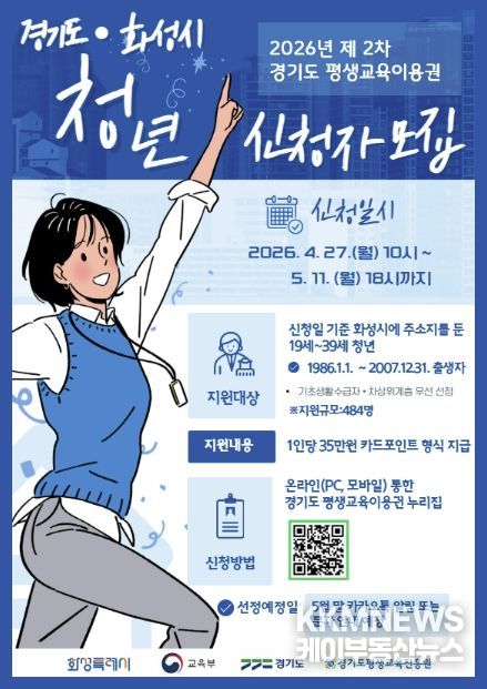 케이부동산뉴스 김교민 기자 | 화성특례시는 청년층의 자기계발과 역량 강화를 지원하기 위해 ‘2026년 평생교육이용권 지원사업’ 지역특화(청년) 분야 2차 이용자를 모집한다고 밝혔다.