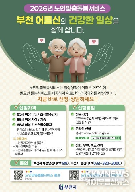 KKMNEWS 김교민 기자 | 부천시는 일상생활이 어려운 취약 노인을 대상으로 맞춤형 돌봄 서비스를 제공하기 위해 4월 27일부터 5월 29일까지 ‘노인맞춤돌봄서비스’ 대상자 발굴을 위한 집중 홍보를 추진한다.