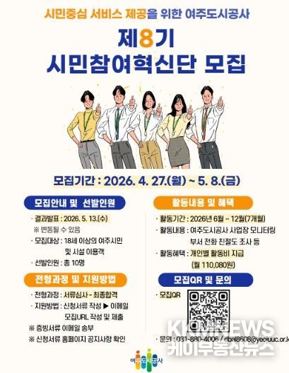 KKMNEWS 김교민 기자 | 여주도시공사는 여주시민 및 이용 고객들의 다양한 의견을 수렴하고, 함께 문제를 해결하는 시민참여형 활동의 일환인 ‘시민참여혁신단 8기’를 모집한다고 밝혔다.