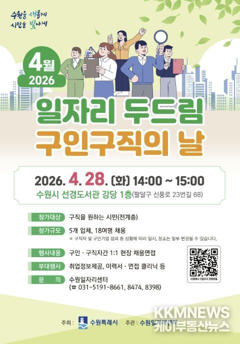 KKMNEWS 김교민 기자 | 수원특례시는 4월 28일 오후 2시부터 3시까지 선경도서관 강당에서 ‘4월 일자리 두드림 구인·구직의 날’을 개최한다.