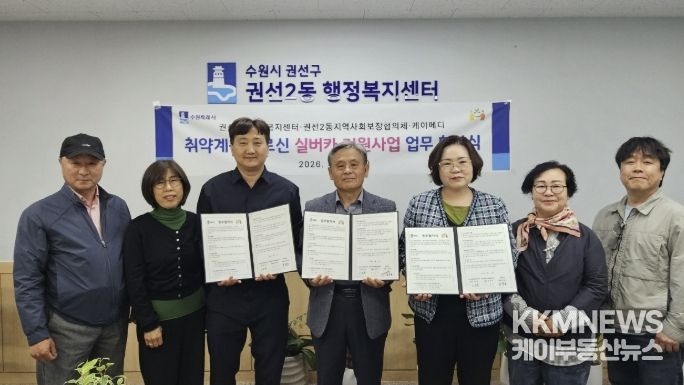 KKMNEWS 김교민 기자 | 수원시 권선구 권선2동은 지난 23일, 권선2동 지역사회보장협의체, 케이메디와 취약계층 어르신의 안전한 이동 지원과 삶의 질 향상을 위한 “실버카(보행보조기) 지원사업 업무협약(MOU)”을 체결했다.