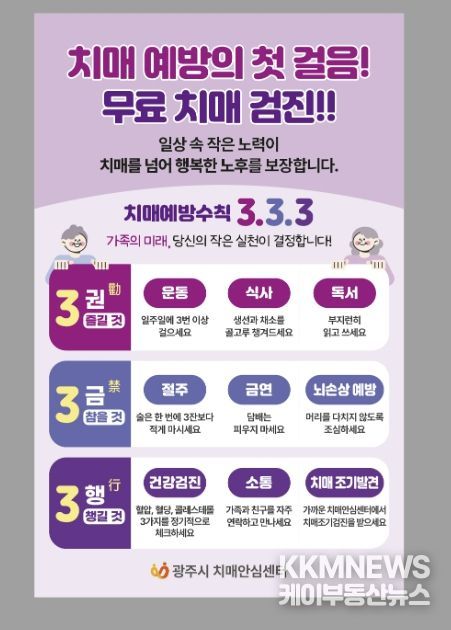 KKMNEWS 김교민 기자 | 광주시치매안심센터는 치매 발병 위험이 높은 고령층을 집중 관리하기 위해 오는 29일부터 30일까지 광주시 스포츠헬스센터에서 ‘치매 조기 검진 및 인식 개선 캠페인’을 실시한다고 27일 밝혔다.