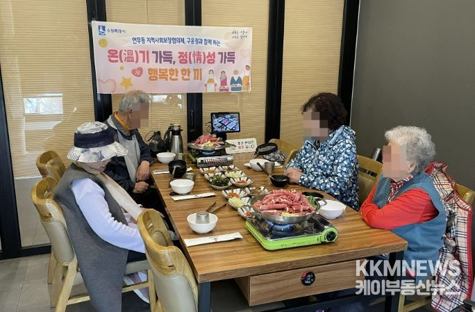 KKMNEWS 김교민 기자 | 수원시 장안구 연무동은 지난 24일, 관내 음식점 ‘구운정’에서 지역 취약계층 어르신들을 모시고 ‘온(溫)기 가득, 정(情)성 가득 행복한 한 끼’ 나눔 행사를 진행했다고 밝혔다.