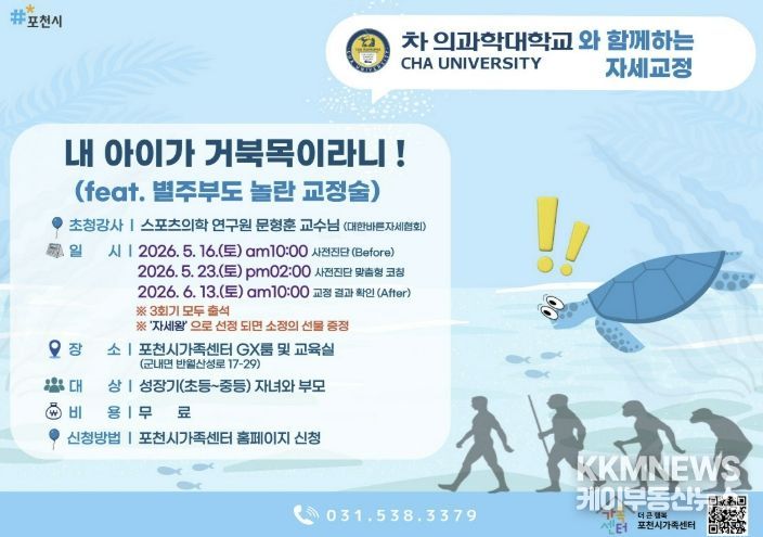 KKMNEWS 김교민 기자 | 포천시 더 큰 행복 포천시가족센터는 오는 5월 16일부터 6월 13일까지 성장기 자녀를 둔 가족을 대상으로 부모역할지원사업 ‘내 아이가 거북목이라니! feat.별주부도 놀란 교정술’ 프로그램을 운영한다.