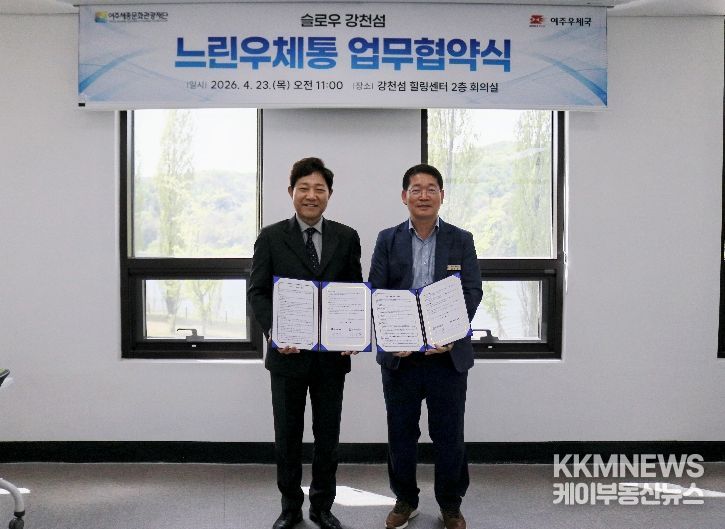 KKMNEWS 김교민 기자 | 여주세종문화관광재단과 여주우체국은 4월 23일 강천섬 힐링센터에서 ‘슬로우 강천섬 느린우체통 업무협약(MOU)’을 체결했다. 빠르게 흘러가는 일상 속에서 잠시 걸음을 멈추고, 소중한 사람에게 미래의 마음을 전할 수 있는 감성 관광콘텐츠를 공동으로 운영하기 위해서다.