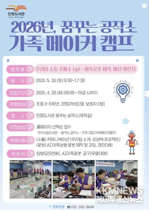 KKMNEWS 김교민 기자 | 구리시 인창도서관‘꿈꾸는 공작소’는 오는 5월 16일 초등학생 자녀와 보호자가 함께 참여해 가족 간 유대감을 높이고 인공지능을 체험하는 '우리 팀 소통 주파수 Up! : 이족로봇 제작, 미션 챌린지' 가족 메이커 캠프를 운영한다고 밝혔다.
