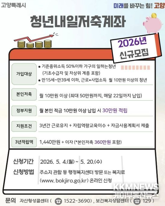 KKMNEWS 김교민 기자 | 고양특례시는 5월 4일부터 시작하는 청년내일저축계좌 신규 가입자 모집을 앞두고, 가입 독려에 나섰다.