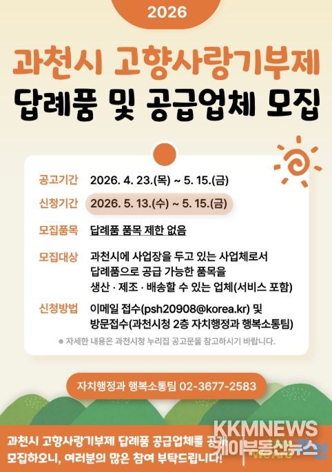 KKMNEWS 김교민 기자 | 과천시는 고향사랑기부제 활성화를 위해 답례품 공급업체를 공개 모집한다고 밝혔다.