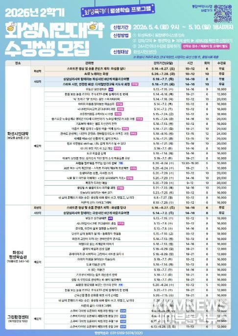 KKMNEWS 김교민 기자 | 화성특례시는 2026년 화성시민대학 2학기 수강생을 오는 5월 4일부터 5월 10일까지 선착순으로 모집한다고 밝혔다.