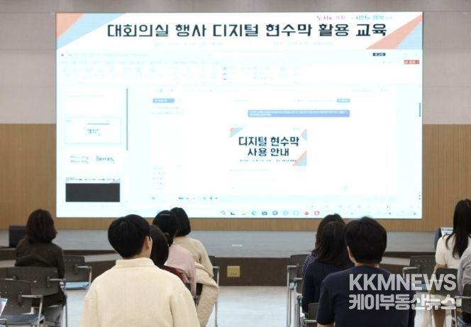 KKMNEWS 김교민 기자 | 군포시는 시청 대회의실에서 개최되는 각종 행사와 회의에 기존의 일회성 실물 현수막 대신, 회의실 내 화면을 활용해 현수막 이미지를 송출하는 ‘디지털 현수막’ 방식을 도입하며 친환경 행정과 예산절감에 나서고 있다고 밝혔다.