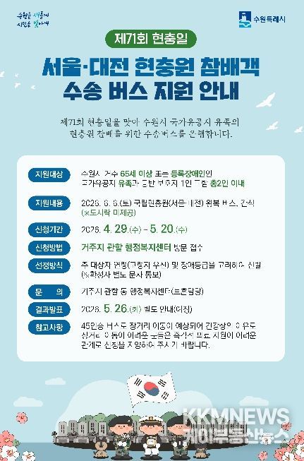 KKMNEWS 김교민 기자 | 수원특례시가 제71회 현충일인 6월 6일, 국립현충원(서울·대전)까지 이동이 여의치 않은 국가유공자 유족을 위해 현충원 왕복 수송버스를 운행한다.