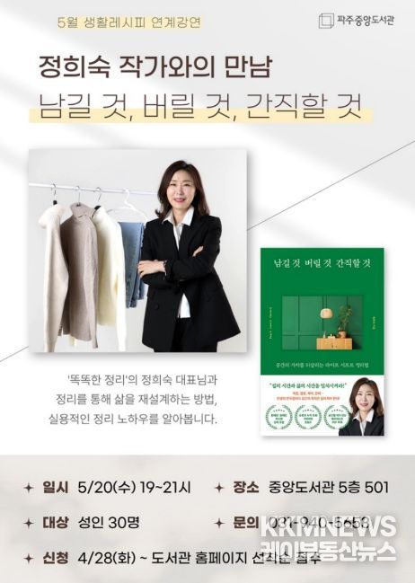 KKMNEWS 김교민 기자 | 파주시 중앙도서관은 오는 5월 20일 19시, 정리 전문가 정희숙 작가를 초청한 '남길 것, 버릴 것, 간직할 것' 강연을 개최한다.