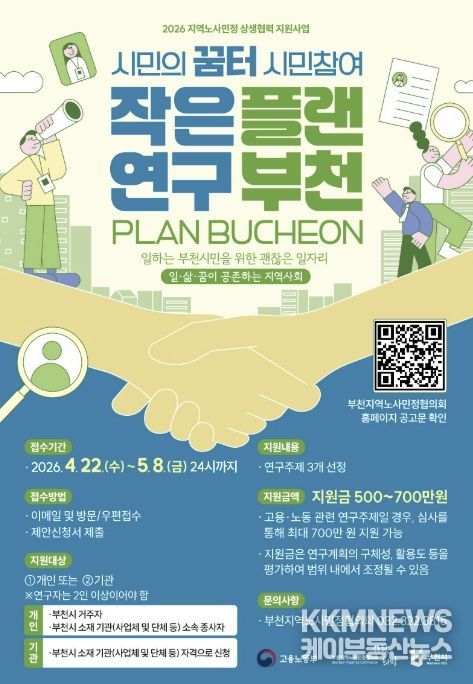 KKMNEWS 김교민 기자 | 부천시는 부천지역노사민정협의회가 지역 노사민정 상생협력 지원사업의 일환으로 시민참여형 연구 공모사업 ‘플랜부천(Plan Bucheon)’을 추진한다고 28일 밝혔다.