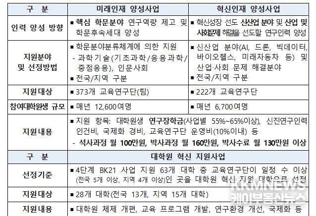 두뇌한국(BK)21 사업은 석·박사급 인재 양성 및 세계 수준의 연구중심대학 육성을 목표로 1999년부터 추진되어 온 대표적인 대학원 지원 사업이다. 현재 4단계 사업(7년, ’20.9.~’27.8.)이 운영 중이며, 매년 약 2만 명의 대학원생과 신진 연구자를 지원하고 있다.