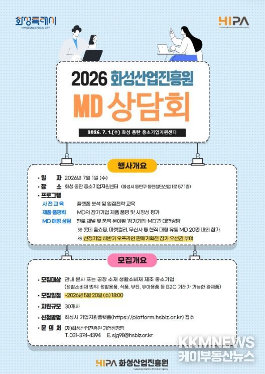 KKMNEWS 김교민 기자 | 화성산업진흥원(원장 전병선)은 화성시 생활소비재 기업의 대형 유통망 진입과 신규 판매채널 확보를 지원하기 위해 ‘2026년 화성산업진흥원 MD 상담회’를 개최하고, 오는 5월 20일까지 참여기업을 모집한다.