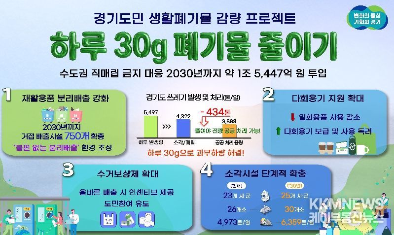 KKMNEWS 김교민 기자 | 수도권 직매립 금지에 따른 생활쓰레기 감량을 위해 경기도가 2030년까지 5년간 약 1조 5,447억 원을 투입하는 ‘하루 30g, 도민실천형 생활폐기물 감량 프로젝트’를 추진한다.
