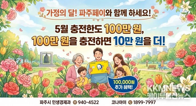 KKMNEWS 김교민 기자 | 파주시는 5월 가정의 달을 맞아 5월 1일부터 5월 31일까지 한 달간 지역화폐 파주페이의 월 충전한도를 기존 70만 원에서 100만 원으로 상향한다.
