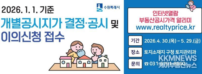 KKMNEWS 김교민 기자 | 수원시 영통구는 2026년 1월 1일 기준 개별공시지가를 4월 30일 결정·공시하고, 5월 29일까지 이의신청 기간을 운영한다.