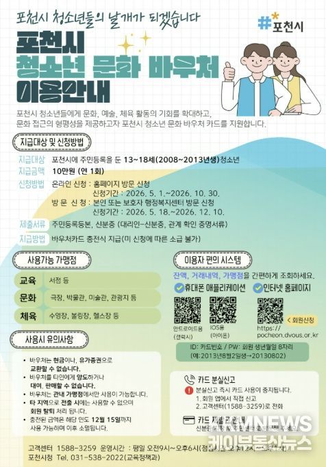 KKMNEWS 김교민 기자 | 포천시는 청소년의 문화 접근성을 높이고 다양한 체험 기회를 제공하기 위해 ‘포천시 청소년 문화 바우처 지원사업’을 본격 시행한다.