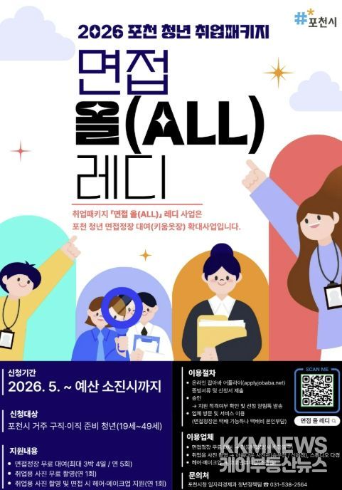KKMNEWS 김교민 기자 | 포천시는 구직 및 이직을 준비하는 청년들의 취업 준비 부담을 낮추고 취업 경쟁력을 높이기 위해 오는 5월 2일부터 2026 포천 청년 취업패키지 ‘면접 올(ALL) 레디’ 사업을 운영한다.