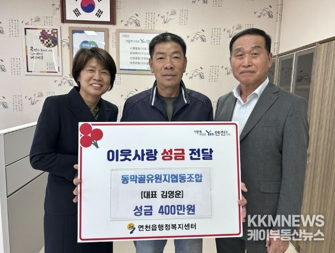 KKMNEWS 김교민 기자 | 동막골유원지협동조합은 지난 28일 오후 4시 연천읍행정복지센터 읍장실에서 이웃돕기 후원 성금 400만 원을 기탁했다.