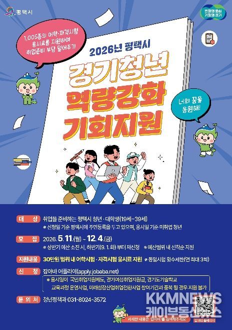KKMNEWS 김교민 기자 | 평택시는 미취업 청년들의 취업 준비 부담을 덜어주고 취업에 필요한 자격 기준을 갖출 수 있는 기회를 마련하여 지속적인 취업 도전 의지를 제고해주는 '경기청년 역량강화 기회지원'사업을 추진한다.