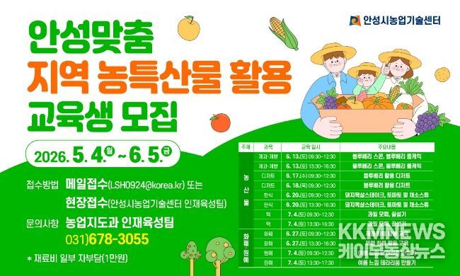 KKMNEWS 김교민 기자 | 안성시농업기술센터는 지역 농산물을 활용한 실습 교육을 통해 소비를 촉진하고 ‘지산지소(지역에서 생산된 농산물을 지역에서 소비함)’ 문화를 활성화하고자, 오는 5월 4일부터 6월 5일까지 교육생을 모집한다고 밝혔다.