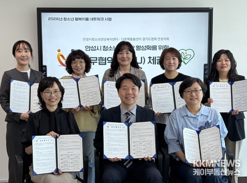 KKMNEWS 김교민 기자 | 안성시청소년상담복지센터는 지난 27일 안성맞춤공감센터에서 다함께돌봄센터 경기도협의회 안성지회와 청소년의 건강한 성장과 복지 증진을 위한 업무협약(MOU)을 체결했다.